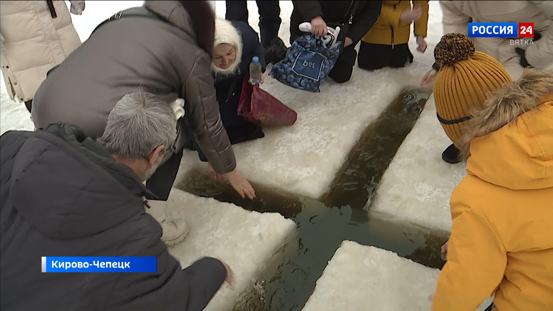 На Вятке уже была подготовлена купель и вырезан крест во льду. Воду священники освятили, погрузив в нее с молитвой крест, после чего верующие поспешили умыться в купели или набрать воды в бутылки.