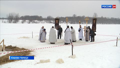 Чин освящения воды в эти дни происходит дважды - в Крещенский сочельник 18 января, и в сам праздник 19 января. После Литургии, которую во Всесвятском соборе Кирово-Чепецка возглавил митрополит Марк, верующие отправились к реке небольшим крестным ходом.
