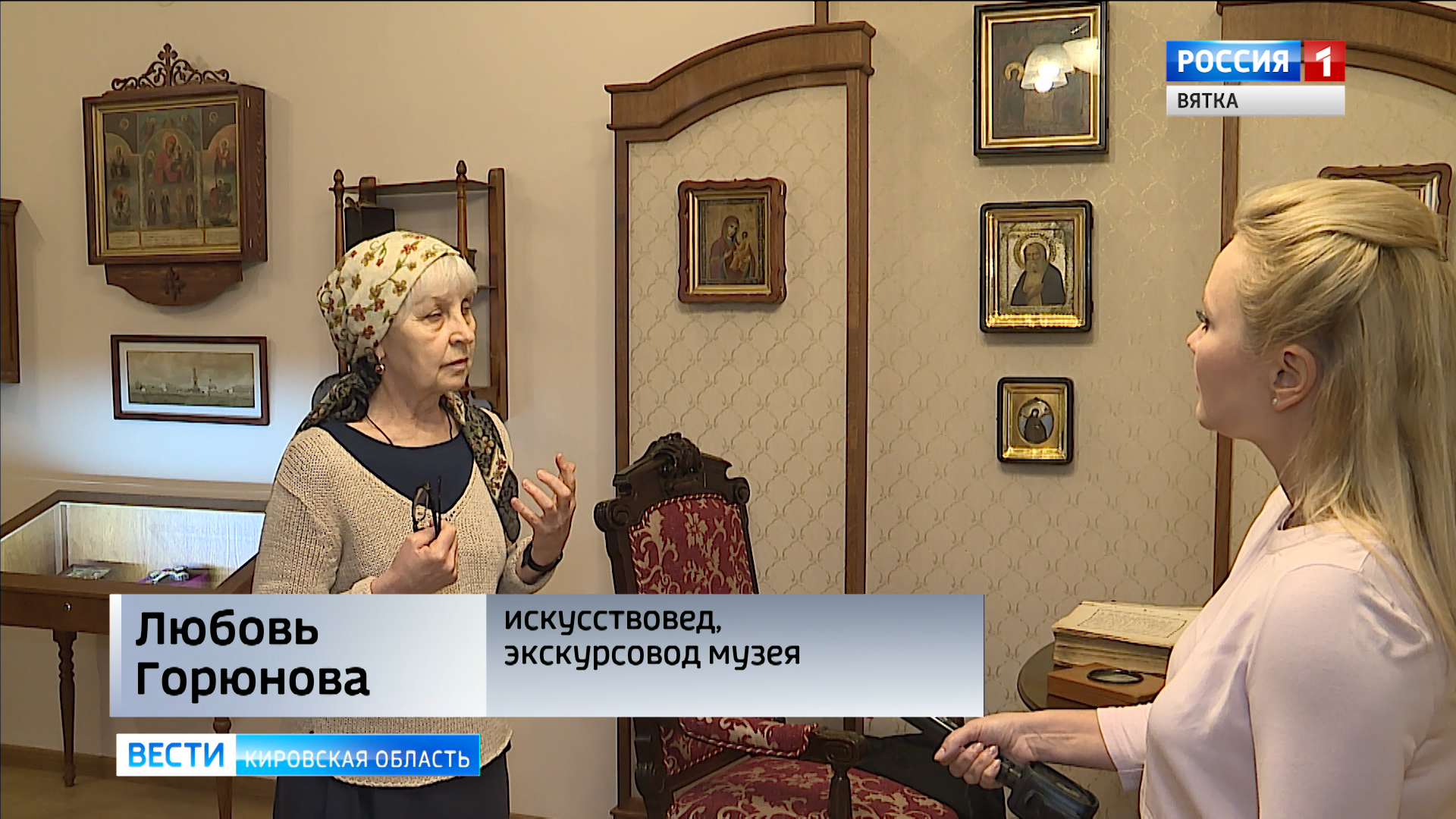 ЛЮБОВЬ ГОРЮНОВА, ИСКУССТВОВЕД, ЭКСКУРСОВОД МУЗЕЯ:«Когда мы только начинали делать экспозицию, нам принесли мемориальный вещи последней игуменьи. Здесь и уникальные часы, подсвечник, Библия, кресло игуменьи, сделанное, кстати, в вятских кустарных мастерских».