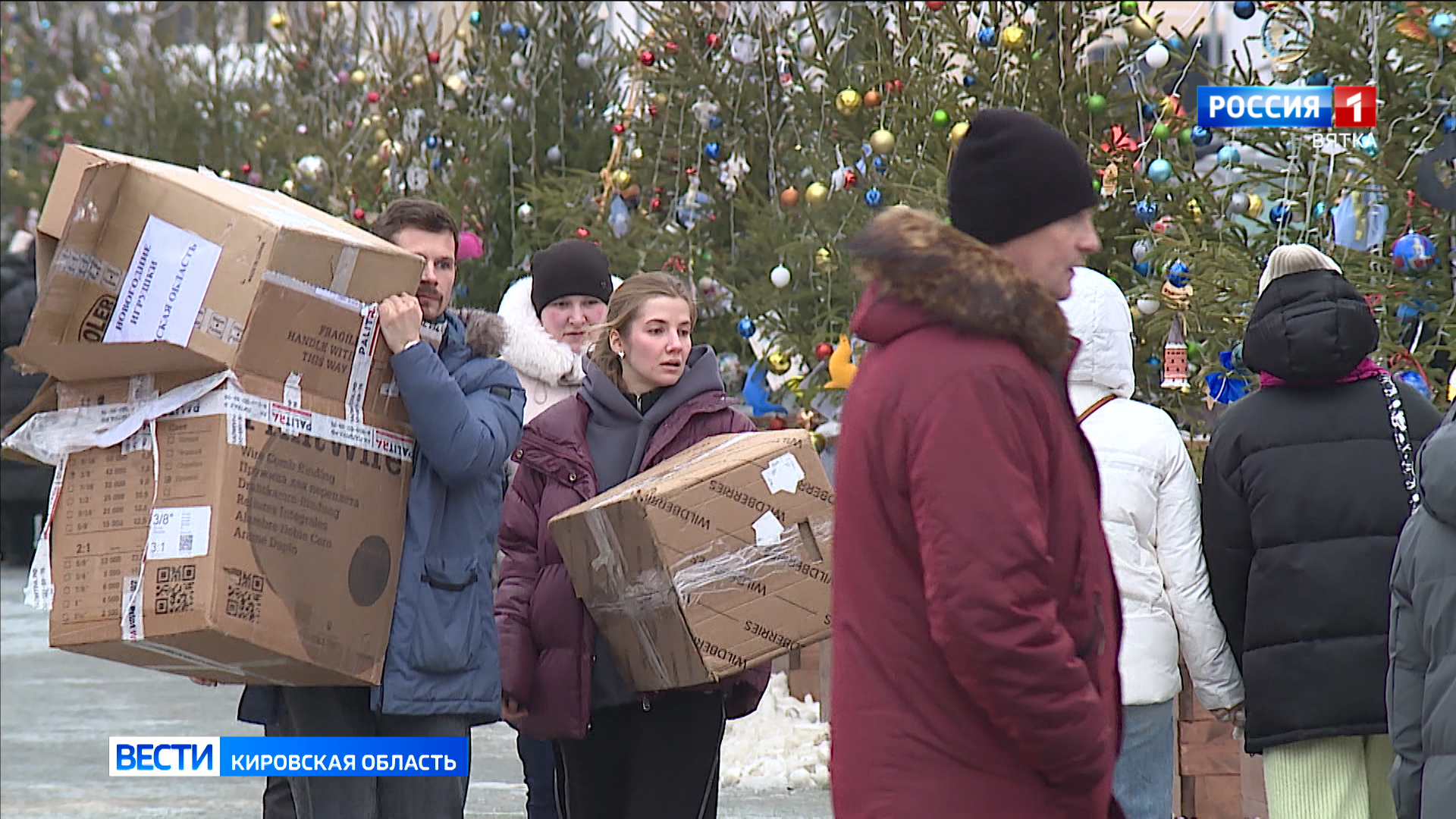Трудности в работе создают погодные условия, из-за дождя, передвигаться с коробками приходится осторожно, чтобы не повредить ценный груз - елочные игрушки, но волонтеры уверены - закончат точно в срок.
