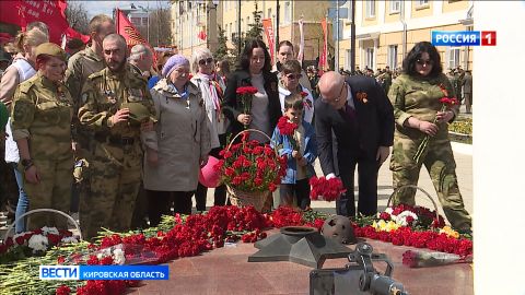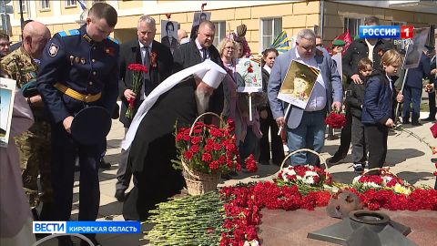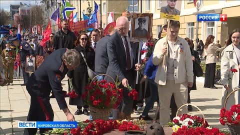 Чтобы возложить цветы к Вечному огню, в народной колонне от Театральной площади прошла и семья губернатора Кировской области Александра Соколова.