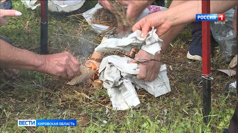 Еще один не самый простой этап — "пережги нитку". У участников была одна спичка и природные материалы — береста, сено и щепки, чтобы разжечь костёр и пережечь нитку. Команде "Шижма-1" понадобилось меньше минуты, чтобы справиться с этим заданием.