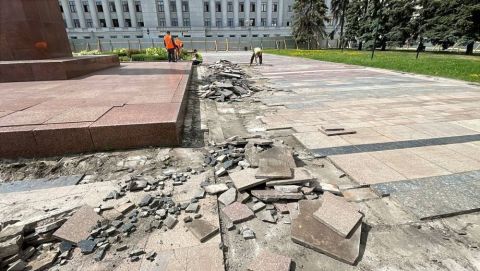 - Предварительно территория была огорожена забором для обеспечения безопасности. Сейчас выполняется демонтаж разрушенной мраморной плитки. Чтобы сохранить часть материала работы проводятся вручную. После этого на объект пустят механизированную технику, - сообщил руководитель дирекции благоустройства Иван Черезов.