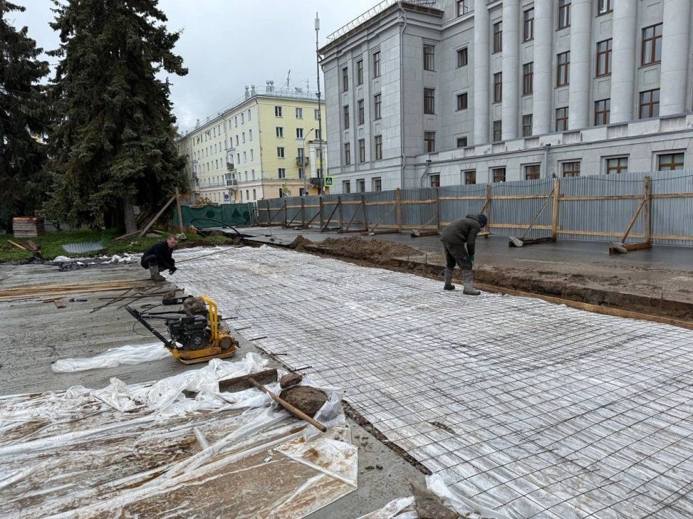 Уже завершен демонтаж старых гранитных плит возле памятника Ленину на главной площади города. Также подрядчик сделал более половины подпорных стен и на них уже начал монтировать гранит. Активно ведутся работы по устройству наружного освещения: сделан прокол, прокинуты гильзы и кабели, заказаны опоры освещения.