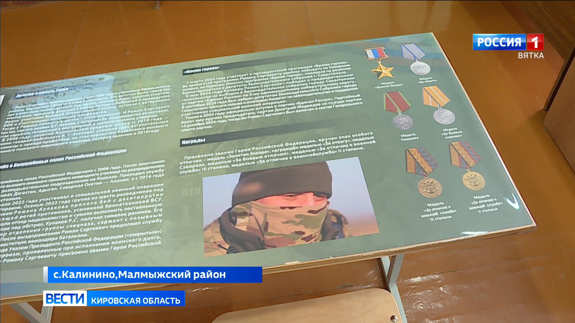 Сама парта — как музейный экспонат. На ней текст биографии парня, который получил золотую звезду Героя, и его фотографии. Вот он с друзьями, его родная школа, учеба в казанском танковом училище. И будни уже боевого офицера на специальной военной операции.