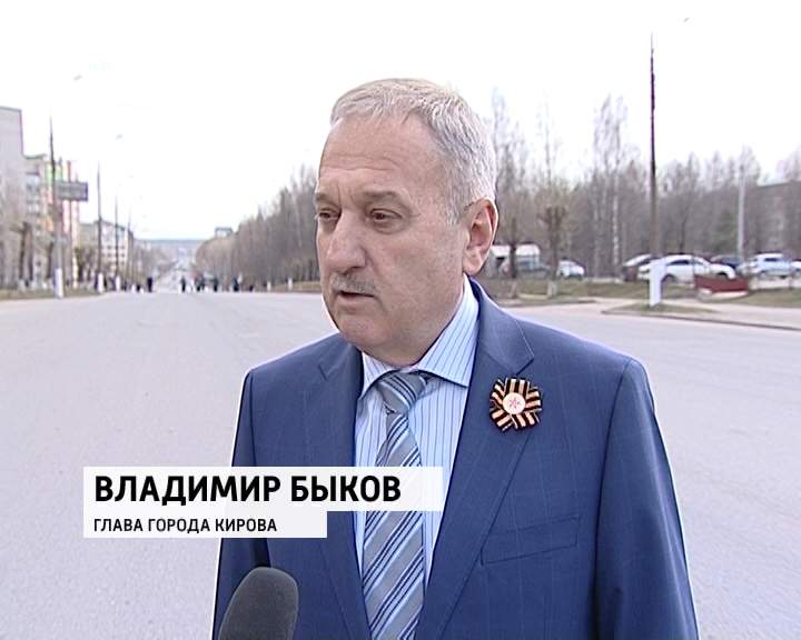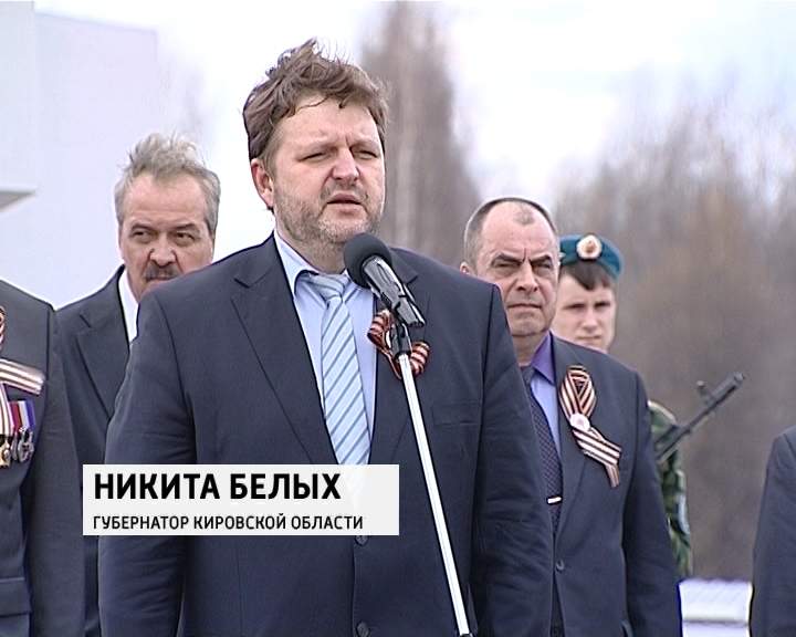 В 14:25 официальный символ Победы - копию Знамени Победы передали в руки первого знаменосца - ветерана Великой Отечественной войны Алексея Вавилова. Затем знамя перешло губернатору Никите Белых, он передал эстафету главе города Кирова Владимиру Быкову.