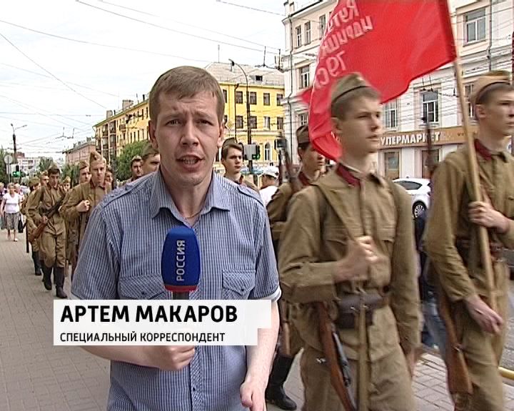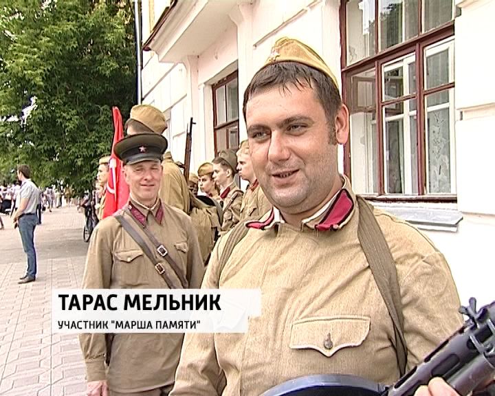 Пожалуй, главное событие дня - возложение цветов к вечному огню. Это еще и точка отсчета для "марша памяти". Командир и молодежь в формах красноармейцев готовятся пройти по улицам.