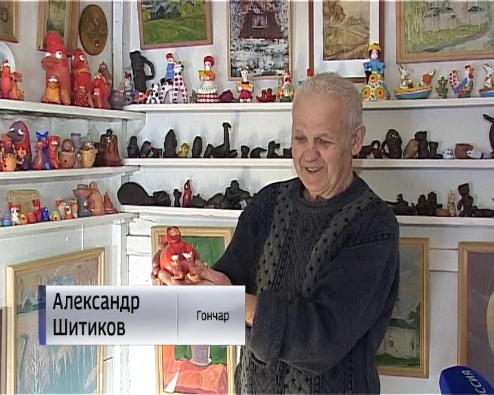 В доме Александра Шитикова нет ни одной свободной стены. Картины, игрушки, свистки, чашки - вся эта коллекция собиралась годами. Здесь он живет, творит, отдыхает и принимает учеников. Почти 40 лет знаменитый белохолуницкий гончар занимается любимым ремеслом. В сентябре, к своему седьмому юбилею, он проведет выставку лучших работ в местном краеведческом музее. Часть будущей экспозиции он по секрету показал нам, в том числе самые сложные в изготовлении работы.