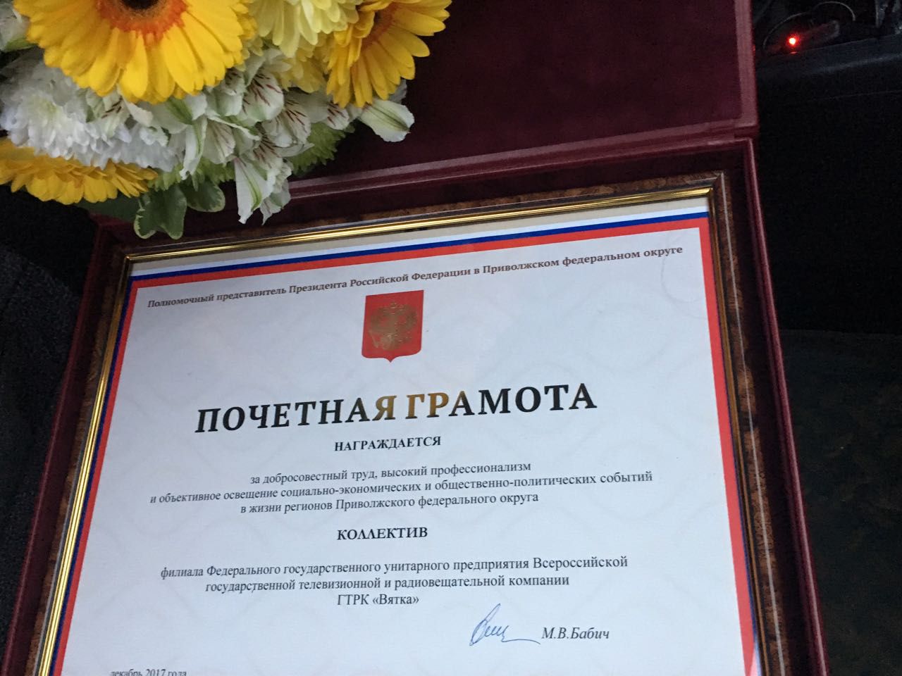 В их числе - коллектив ГТРК Вятка. За добросовестную работу, профессионализм и объективное освещение общественно-политических событий ГТРК Вятка вручили Почетную грамоту Полномочного Представителя Президента РФ в ПФО.