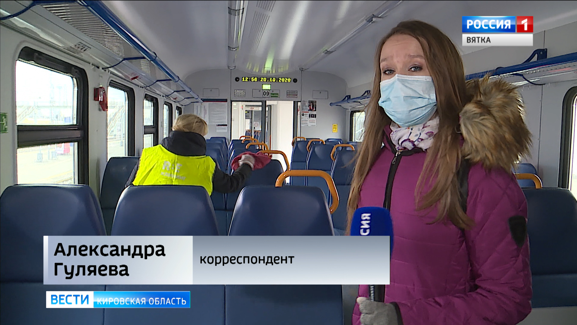 Затем полицейские встречают на платформе пассажиров, которые приехали в Киров на электричке из Котельнича. Из вагонов люди выходят в масках, а затем, не заходя в здание вокзала, выходят в город. Внутри пустого вагона в этот момент начинается усердная работа.
