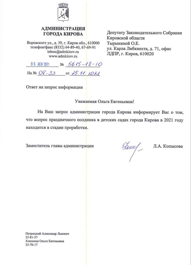 От муниципалитета с подписью заместителя главы администрации Кирова Ларисы Копысовой 6 декабря пришло письмо, в котором сообщили, что вопрос праздничного полдника в детских садах в 2021 году находится в стадии проработки.