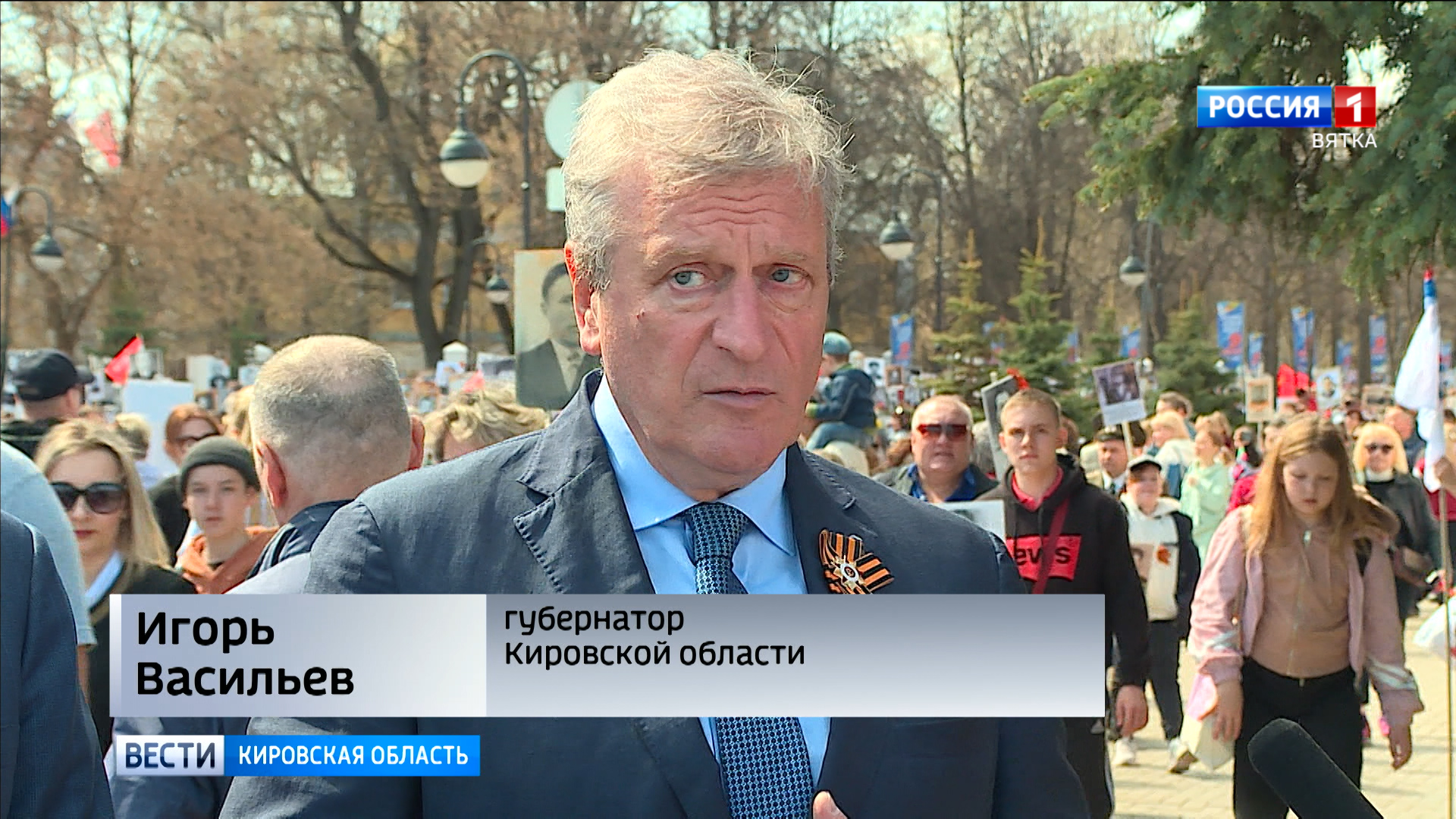 Также глава региона присоединился к участникам акции "Бессмертный полк". В этом году более 5 тысяч кировчан прошли по городу с фотографиями своих героев на транспарантах.