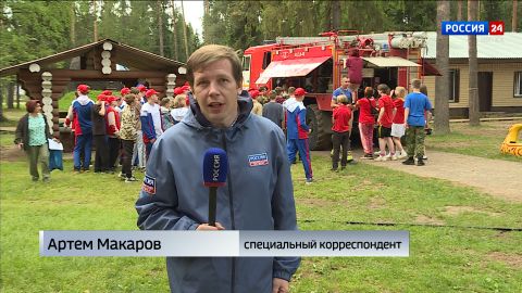 «После того, как учения закончились пожарные не спешат покидать детский лагерь. Для воспитанников они проводят экскурсию. Рассказывают о своей работе и показывают технику, на которой каждый день работают».