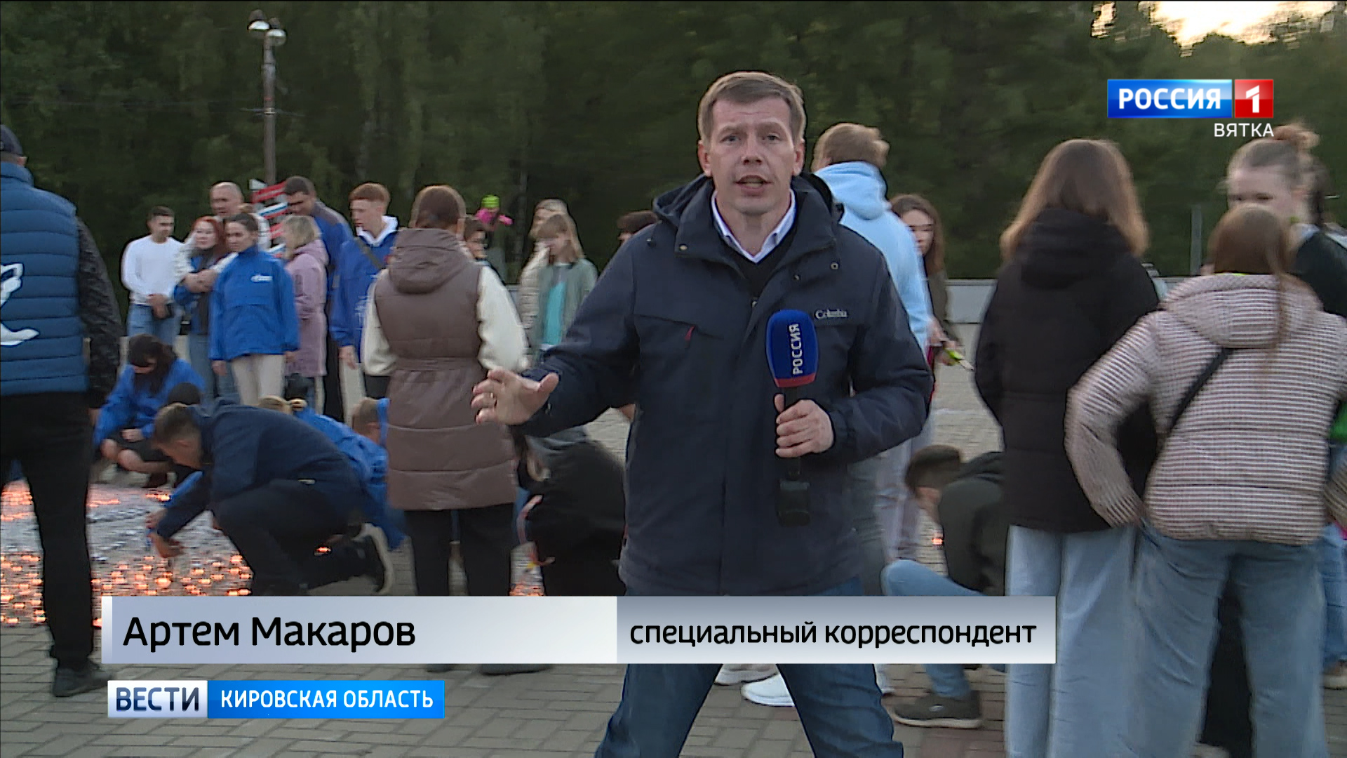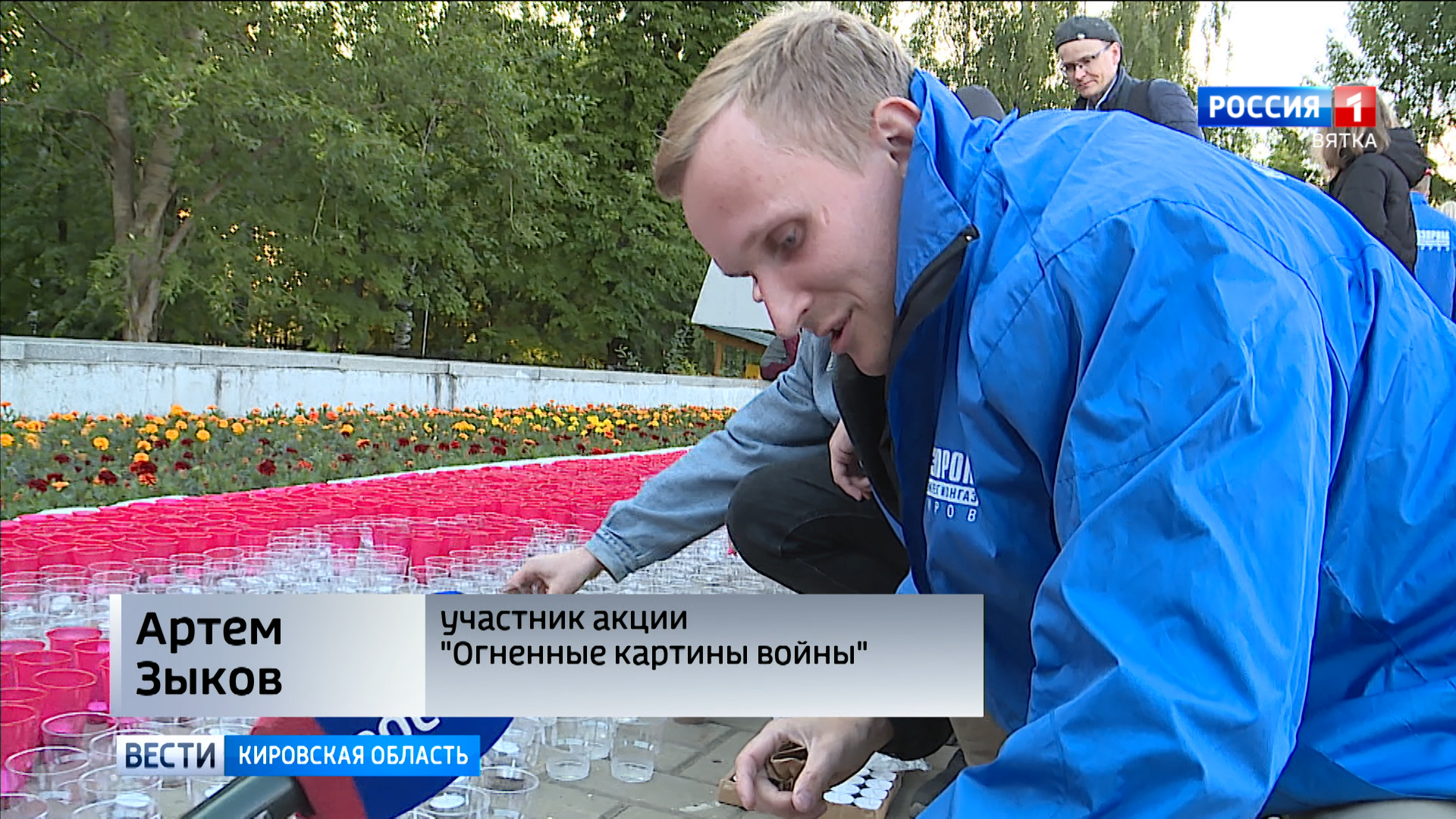 «В парке победы волонтеры сегодня зажгут десять тысяч свечей. Помимо силуэта Григория Булатова с красным знаменем здесь огнем воспылает надпись "Киров помнит"».