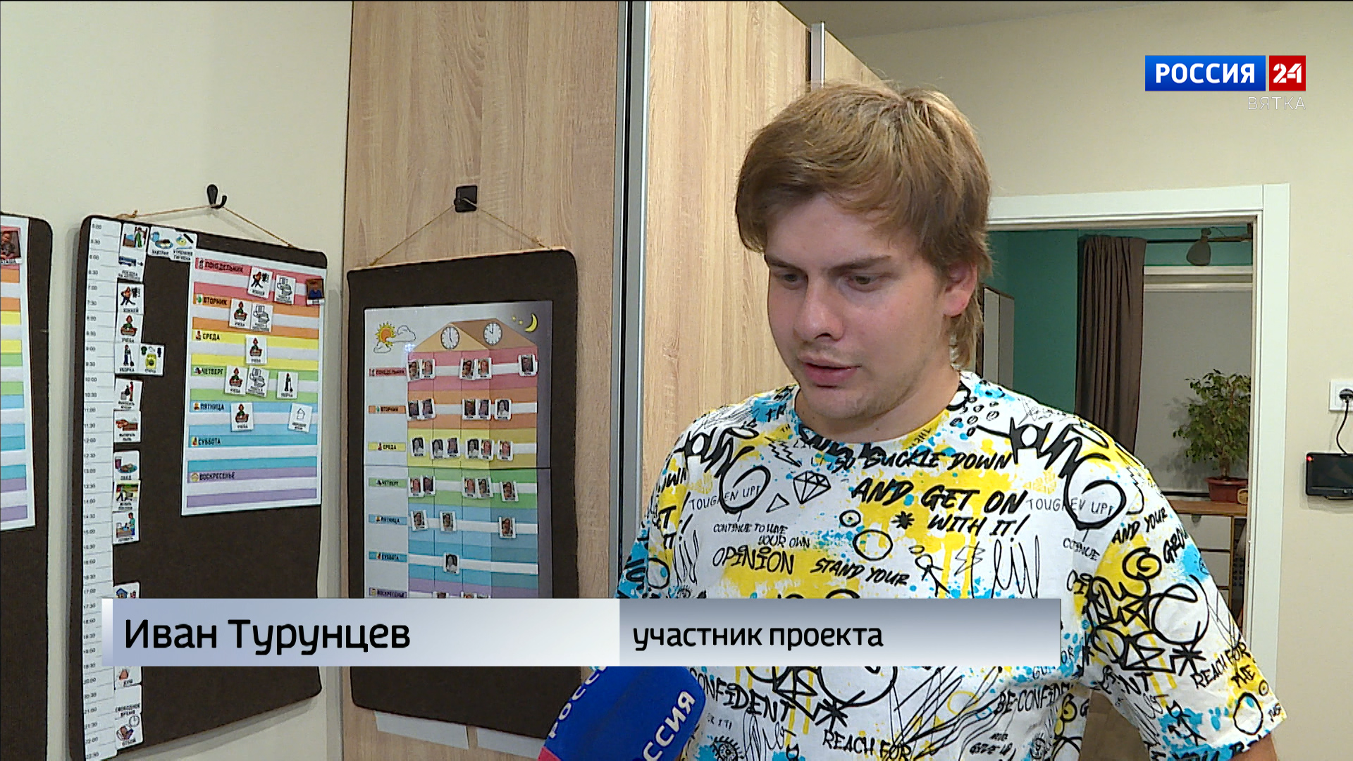 Днем Иван Турунцев учится и работает в типографии. А пока "по-хозяйски" провел для нас экскурсию по квартире. Прихожая, уютная гостиная, в спальных комнатах фотографии на стене и конечно удобная ванная. Это квартира особая, здесь созданы все условия, чтобы каждый смог обучиться самостоятельной жизни.