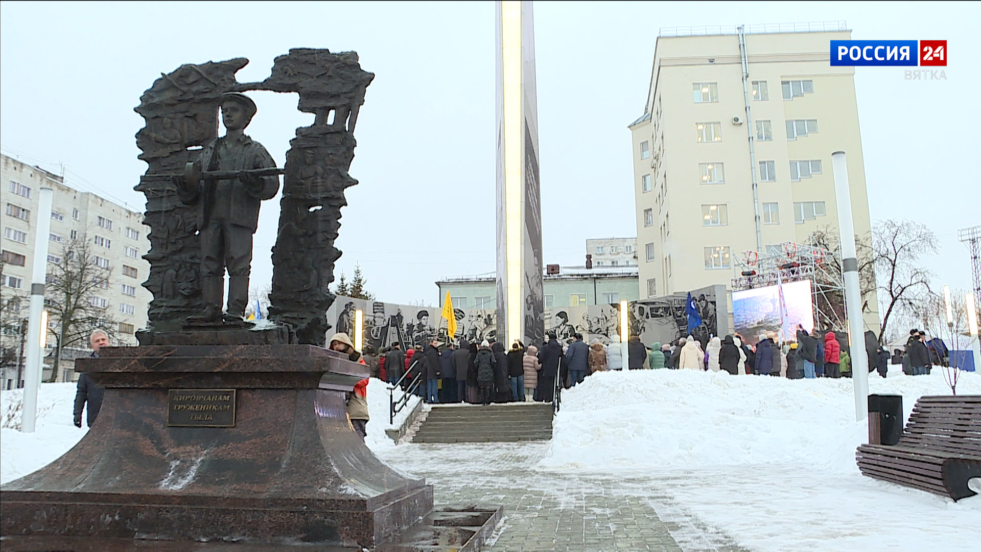«Десятки кировчан пришли этим утром в сквер Трудовой славы в Кирове, чтобы всем вместе открыть стелу, посвященную подвигу кировчан в годы Великой Отечественной войны».