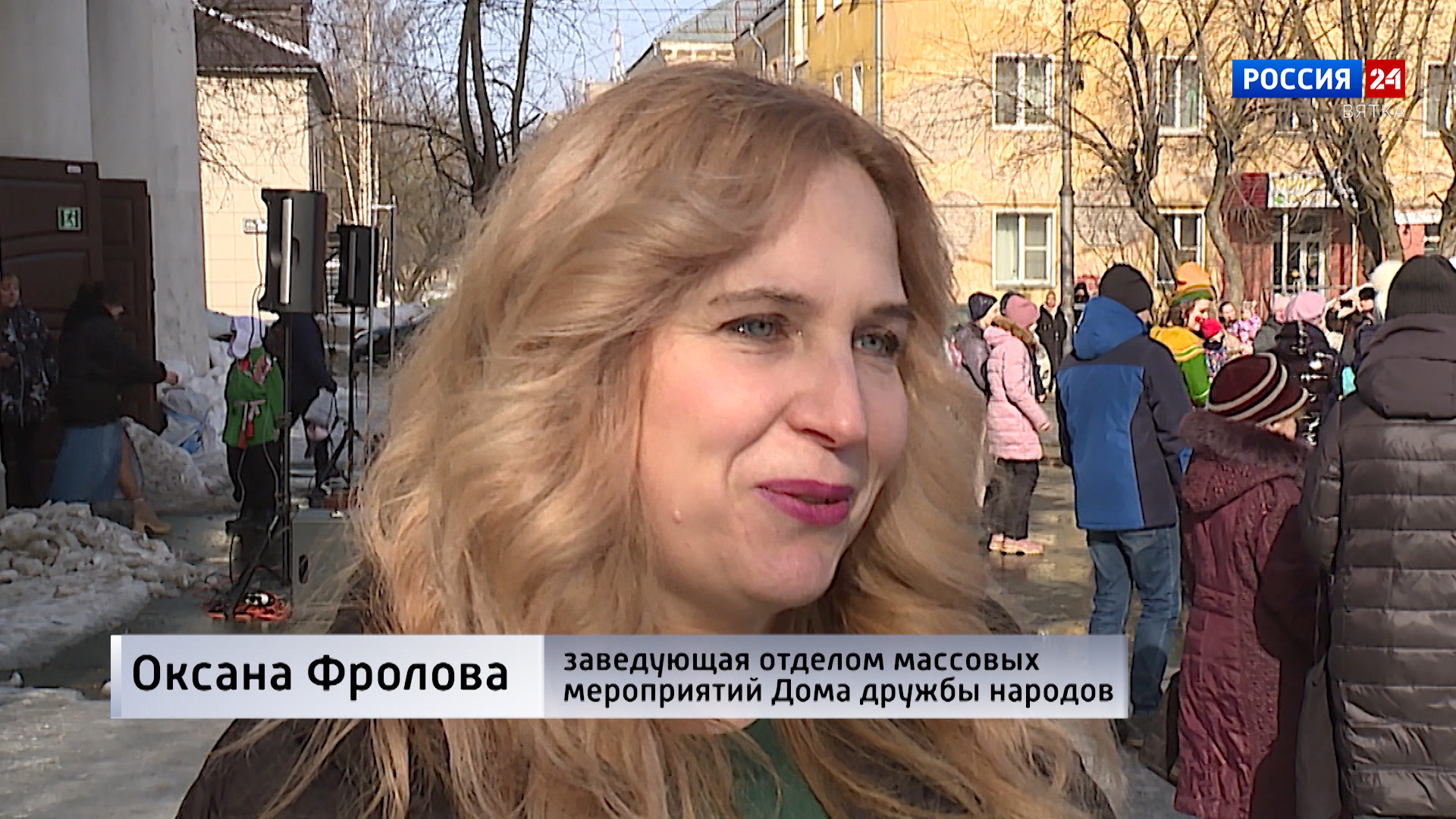ОКСАНА ФРОЛОВА, ЗАВЕДУЮЩАЯ ОТДЕЛОМ МАССОВЫХ МЕРОПРИЯТИЙ ДОМА ДРУЖБЫ НАРОДОВ:«Сегодня праздник у нас большой, мы планируем до 12 часов дня сегодня водить хороводы, угощать всех блинами, призами, поднимать настроение в этом районе. От себя хочу добавить, чтобы у каждого в душе было солнечно и тепло, друг другу желали только добра и были все вместе большой и дружной вятской семьей».