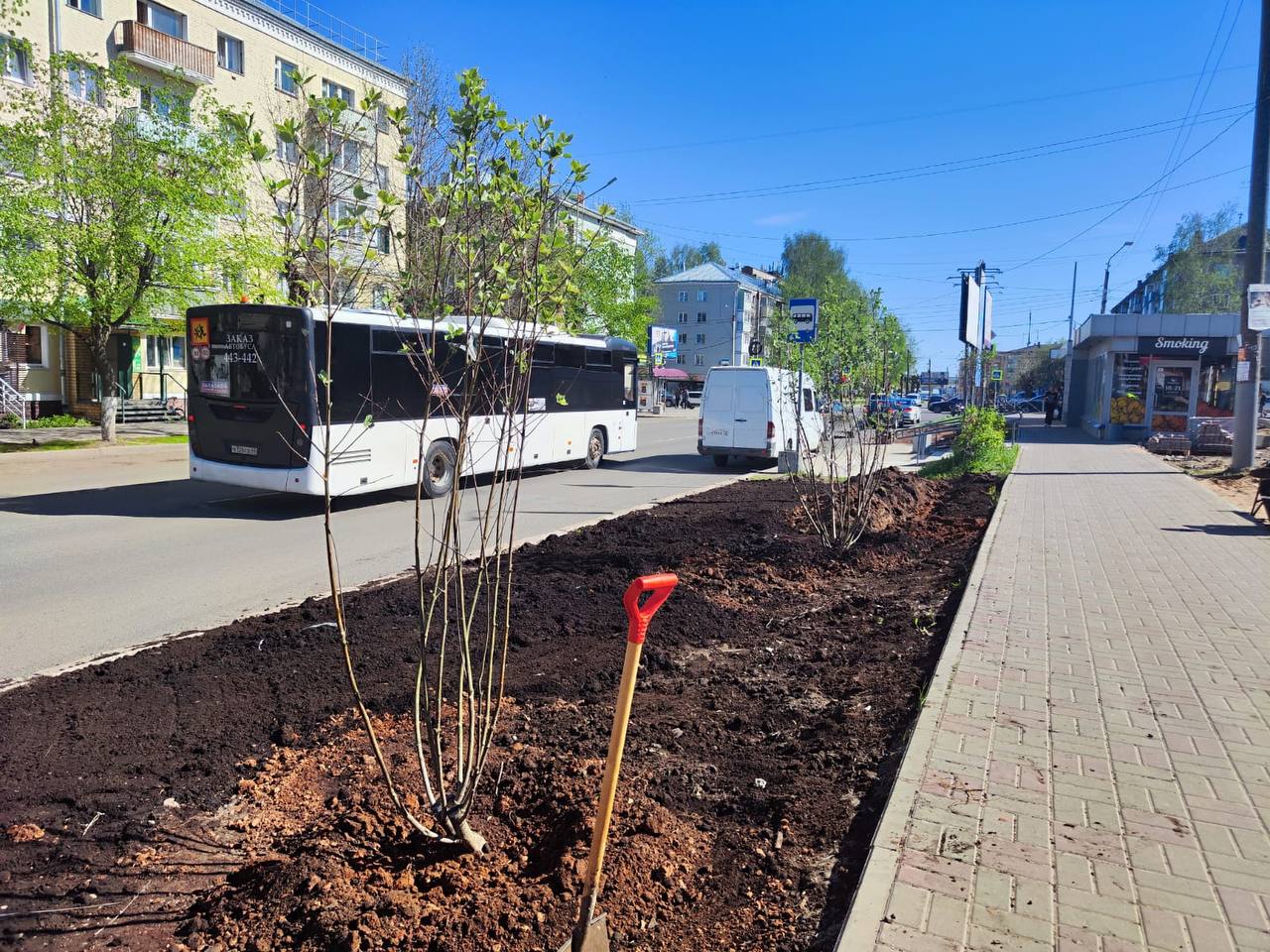 На улице Горького, у автовокзала, специалисты отдела зелёного строительства начали высадку рябин промежуточных. Вскоре их дополнят изгороди из кизильника блестящего и цветочное оформление.