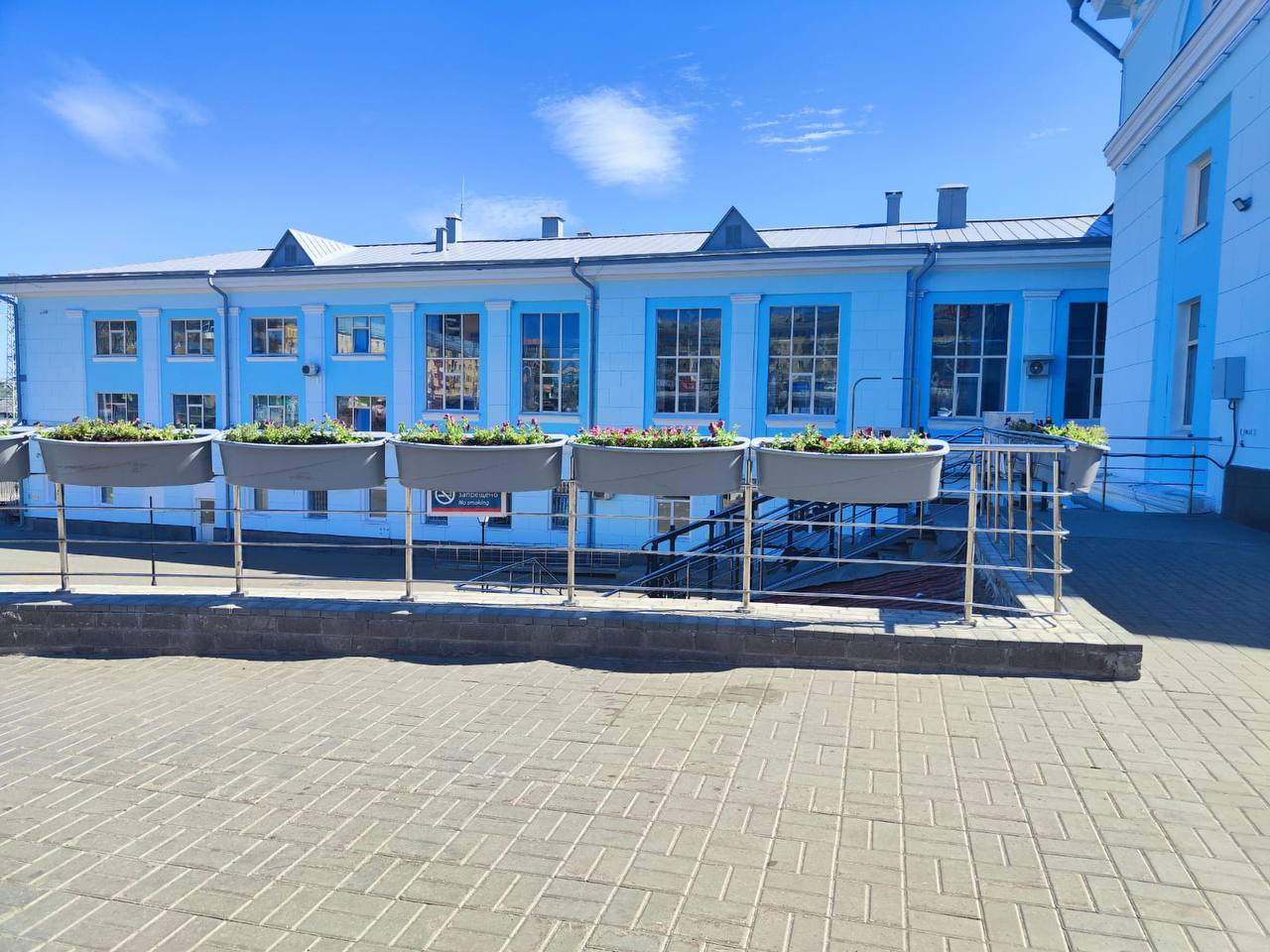 У железнодорожного вокзала после высаживания клумб в стиле орнамента дымковской игрушки занялись размещением гидровазонов с цветами.