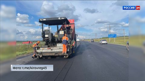 В Вятскополянском районе началась укладка асфальта на участке Вятские Поляны - Кукмор. Всего будет заасфальтировано 3 километра дороги. Ремонт ведется в рамках национального проекта "Безопасные качественные дороги". Работы завершатся до 1 сентября.