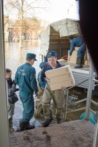 Гуманитарный груз от администрации Первомайского территориального управления доставляется до начала улицы Приозёрной. Далее спасатели перегружают продукты питания в вездеходный КАМАЗ и отправляются в 2-километровый путь по затопленной территории.
