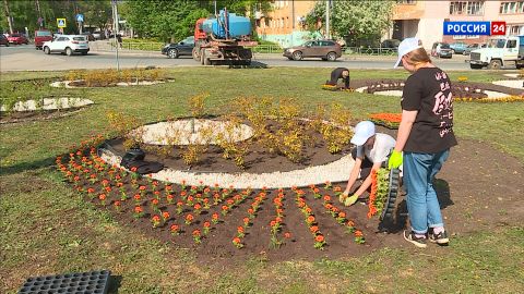 В Кирове проходят работы по озеленению города. На парадной территории у перекрестка Карла Маркса и Преображенской, высаживают однолетние бархатцы и петуньи.
