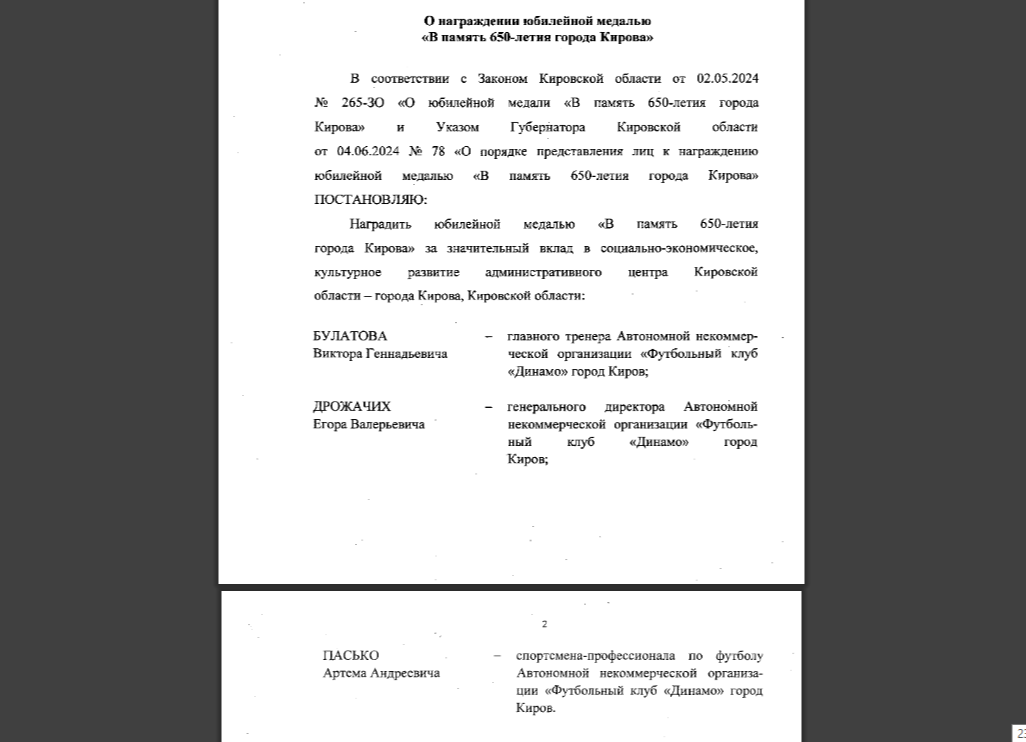 На прошлой неделе, 18 октября, губернатор Кировской области Александр Соколов подписал Указ о награждении юбилейной медалью «В память о 650-летии Кирова» главного тренера Виктора Булатова, гендиректора Егора Дрожачих и капитана кировского «Динамо» центрального защитника Артёма Пасько.