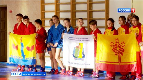 На торжественном параде - участники Всероссийского проекта «Самбо в школу» из Чувашии, Пермского края, Оренбургской и Кировской областей. Учащиеся средней школы Свечи представляют наш регион. В составе команды - 8 спортсменов. Все они занимаются самбо на базе школы.